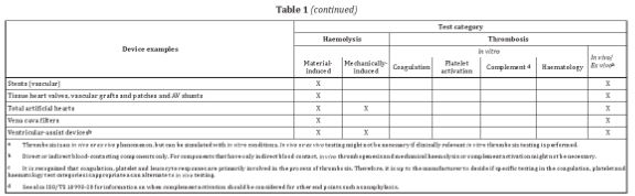 針對外部連通器械和植入器械,表格1列舉了與循環血接觸的常見器械或器械組分,并提供了可參考的測試類別。例如血液監測裝置,可考慮的測試包括:材料介導的紅血球溶解實驗,體外凝血、血小板激活及血液學實驗。